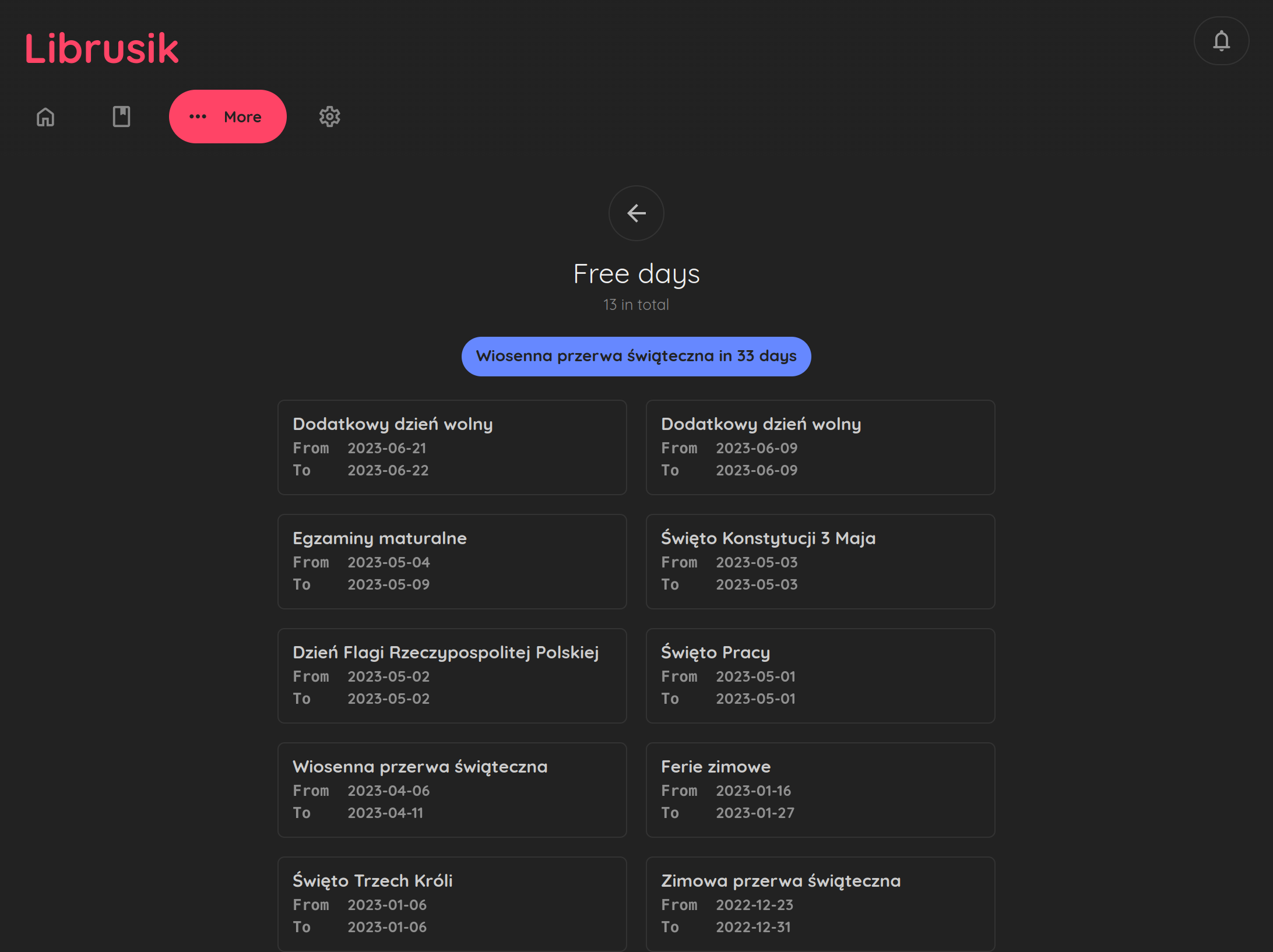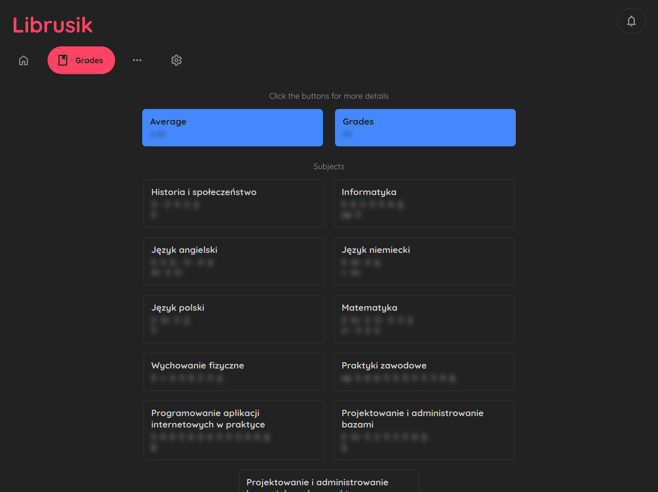 Librusik is a Librus Synergia web client with many excellent features. Access your school things quickly and with ease. Forget about your weird login. Forget even about logging in, as Librusik will remember you. Forget about all school-defined limitations and go beyond them.