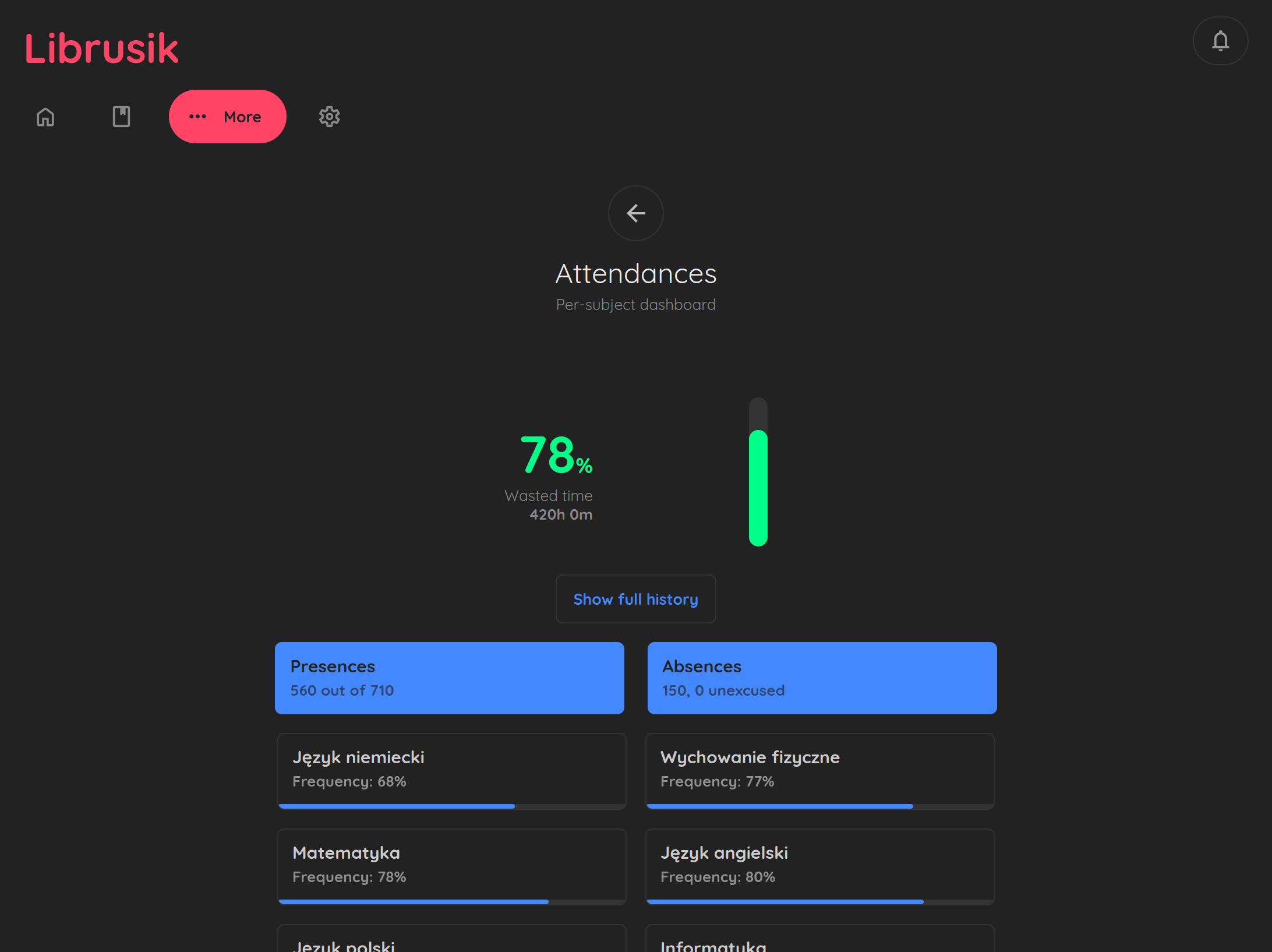 Librusik provides a bunch of great features. Those include independent average calculation and detailed attendances report for each subject.